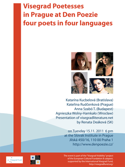 Poetry readings and discussion with the young Visegrad poetesses Katarína Kucbelová (SK), Kateřina Rudčenková (CZ), Anna Szabó T. (HU), Agnieszka Wolny-Hamkało (PL). Presentation of the internet anthology www.visegradliterature.net by Renata Deáková (SK)